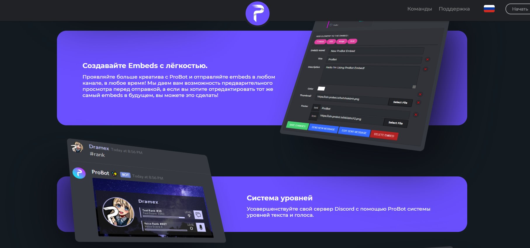 ProBot — еще один многофункциональный бот для администрирования сервера с поддержкой повышения уровней. Он работает по аналогии с Mee6, но имеет свои и особенности, благодаря чему часть пользователей отдает предпочтение именно ему, чтобы не приобретать премиум в упомянутом инструменте.