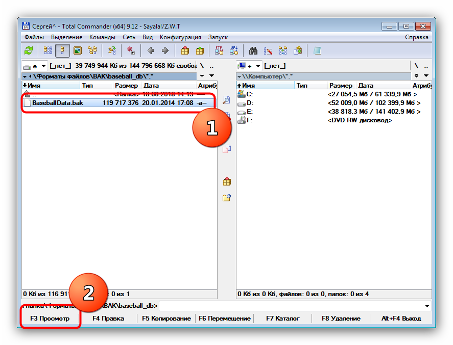 - Total Commander. Файловый и FTP-менеджер, в состав программы входит утилита под названием Lister. Lister использует собственные алгоритмы для анализа содержания и структуры файлов и открывает практически все, что можно. Для использования утилиты нужно запустить Total Commander, найти во встроенном проводнике нужный файл в формате bak, навести на него курсор и нажать F3.
