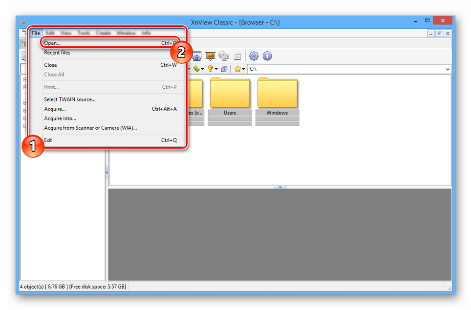 1. Установите и запустите программу, затем в левом верхнем углу раскройте раздел «File» и в выпавшем списке перейдите в «Open».