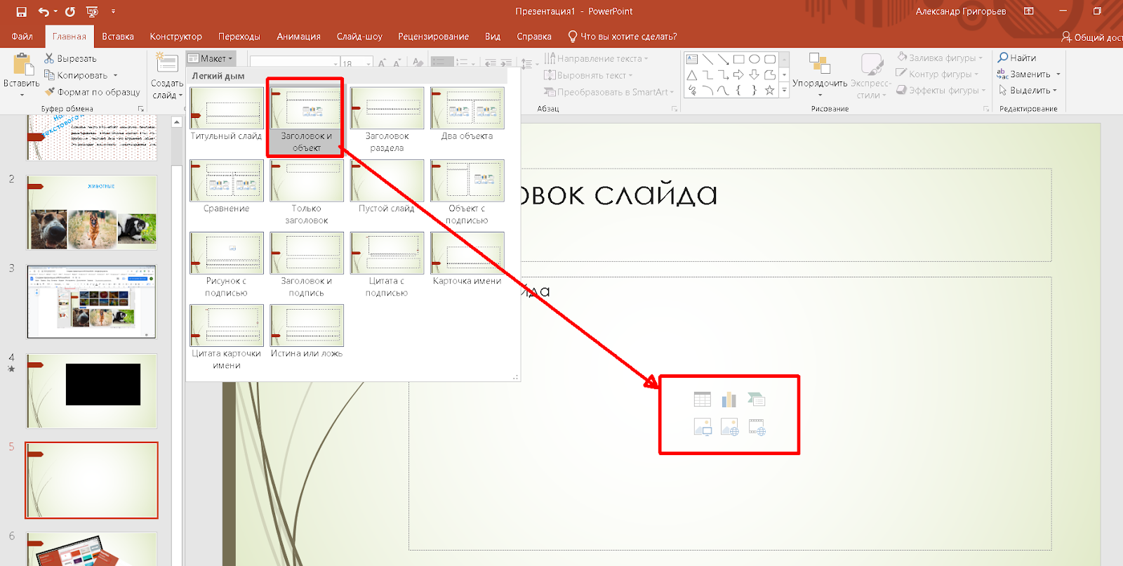 В ПауэрПойнт доступна быстрая вставка внешних объектов в самом слайде. Для этого выберите во вкладке “Макет” вариант структуры с вкладкой “Текст слайда”. В середине листа будут быстрые кнопки вставки.