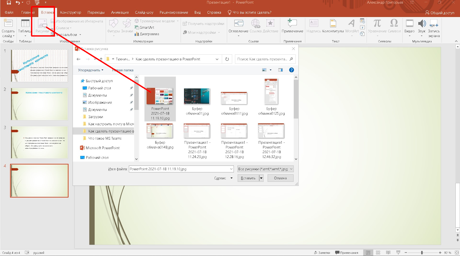 - В меню “Вставка” выбираем “Рисунки”, далее в Проводнике нужный файл изображения.