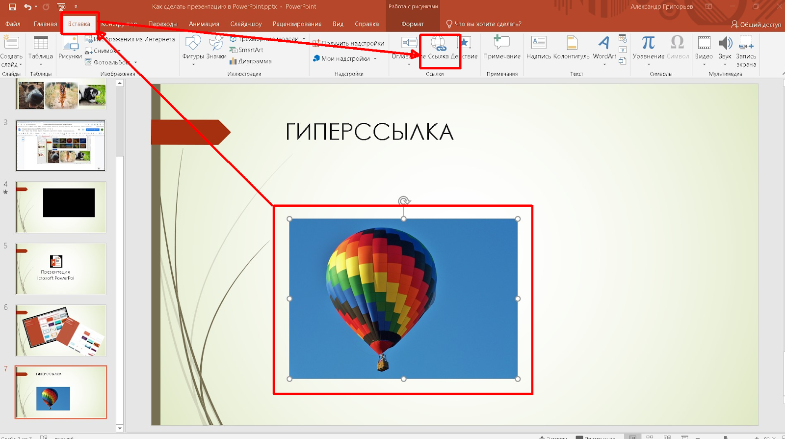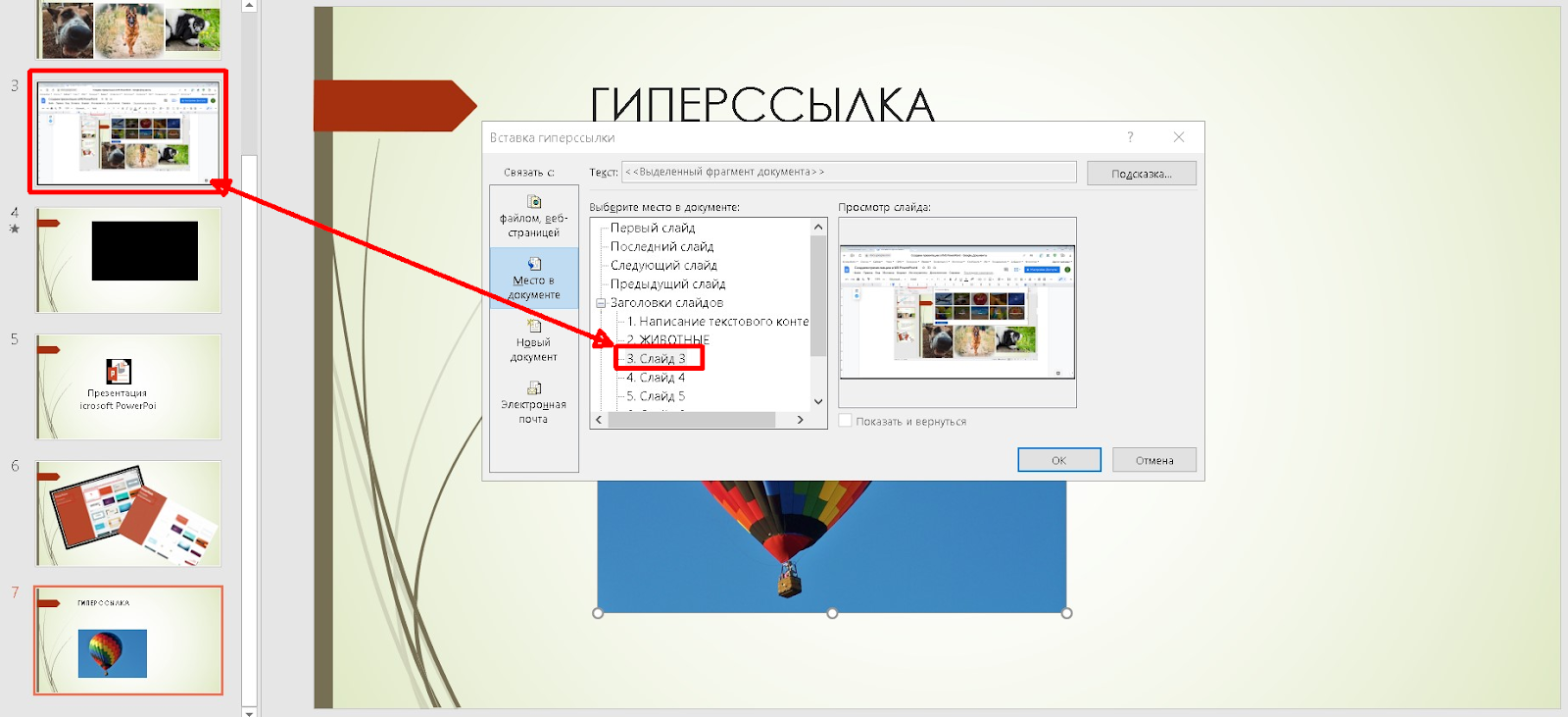 - К примеру, я привязываю ссылку к странице в существующей презентации — Слайду 3. Связь с определенным слайдом можно установить его перетаскиванием на объект создания ссылки. Чтобы перейти по гиперссылке, нужно щелкнуть по ней ЛКМ, удерживая клавишу Ctrl.