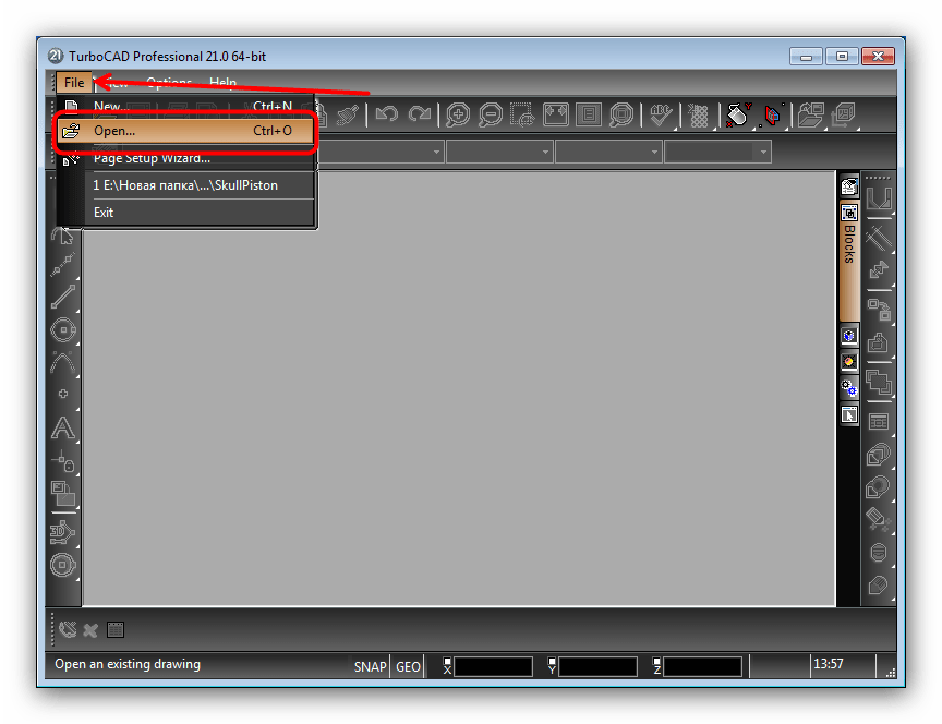 - Запустите ТурбоКАД и поочередно используйте пункты «File» — «Open».