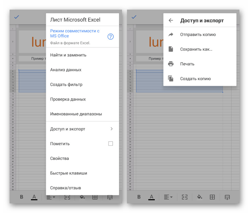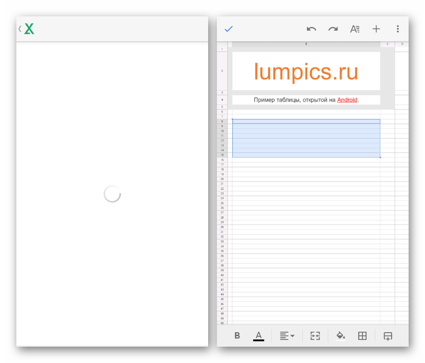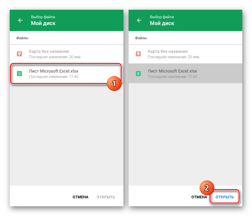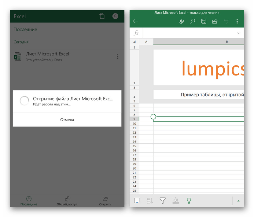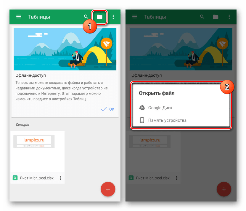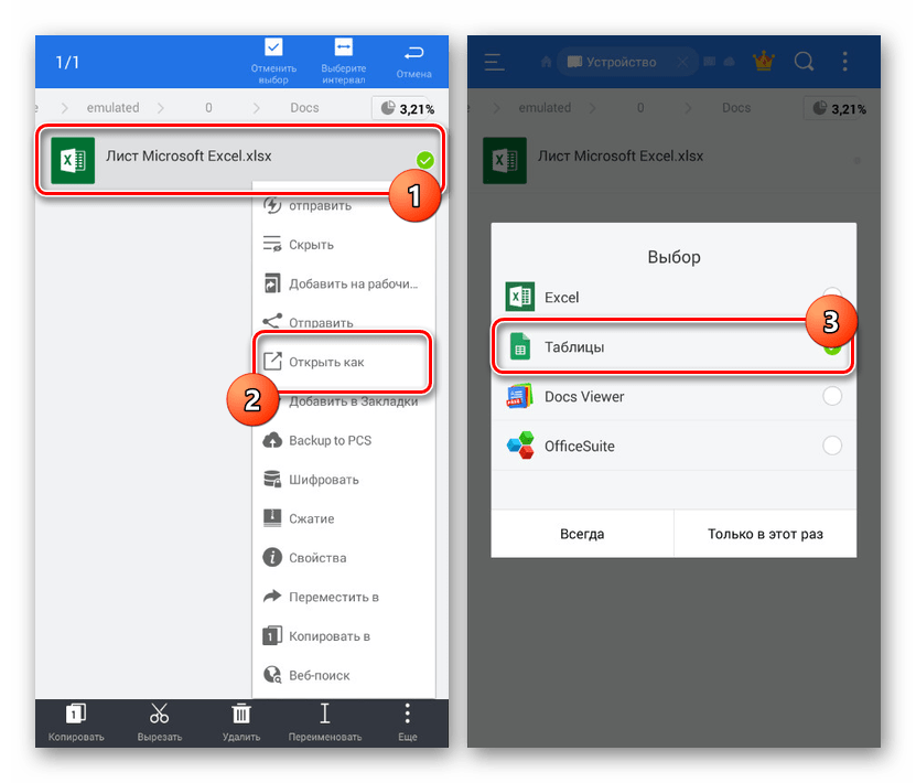 По аналогии с предыдущим приложением, файл XLSX можно открыть напрямую из файлового менеджера, предварительно установив Google Таблицы. В результате ПО будет работать так же, как и при открытии документа ранее описанным методом.