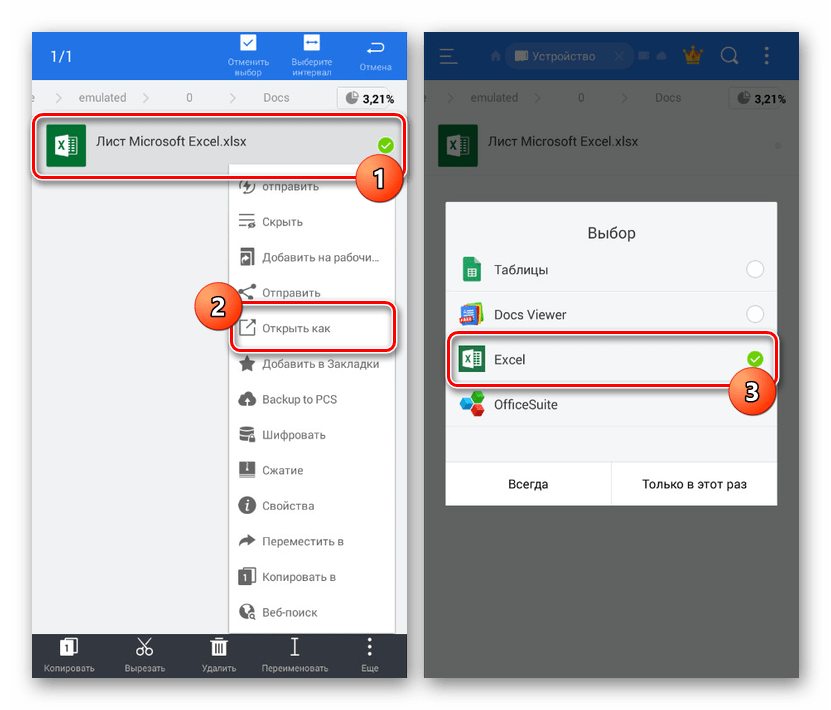 Кроме открытия из приложения можете выбрать программу в качестве средства обработки при использовании любого файлового менеджера. Для этого выберите вариант «Открыть как» и укажите MS Excel.