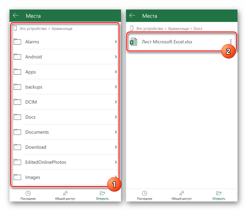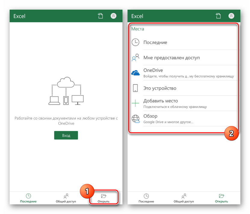 - После установки и запуска приложения через меню в нижней части экрана перейдите на страницу «Открыть». Выберите один из вариантов месторасположения XLSX-файла, например, «Это устройство» или «Облачное хранилище».