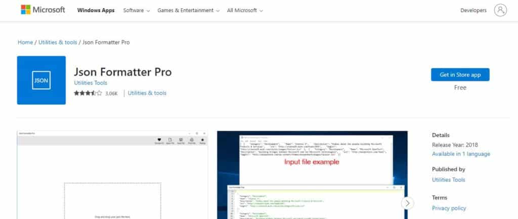 Наконец, мы упомянем очень мощный инструмент как для чтения, так и для редактирования файлов json, который находится в свободном доступе в Microsoft Store (это ваш ссылка на скачивание). Мы ссылаемся на Форматировщик Json Pro.