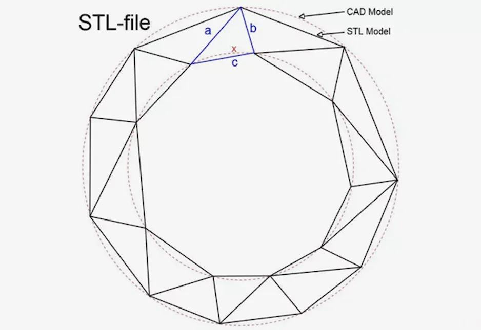 Простое для понимания определение формата файла STL объясняет его как треугольное представление трехмерного объекта. Если вы посмотрите на изображение, чертеж САПР использует плавные линии окружности, а чертеж STL показывает поверхность этого круга в виде серии соединенных треугольников.