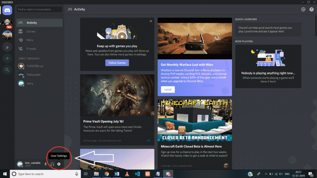 - Для этого сначала откройте игру / приложение, которым хотите поделиться, и клиент Discord. Затем щелкните значок «Настройки» в клиенте Discord, чтобы открыть меню «Настройки пользователя».
