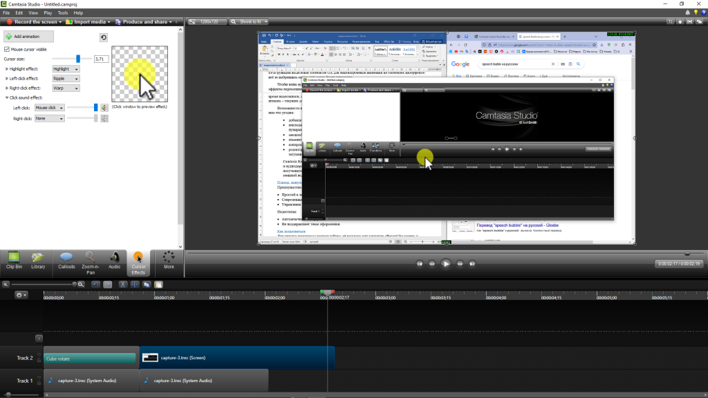 Включайте фантазию, задействуйте творческий потенциал и редактируйте ролик. Его можно делить на части, вырезать ненужные фрагменты, менять звук, добавлять различные объекты, эффекты, настраивать курсор: увеличить размер, подсветить, анимировать клики.