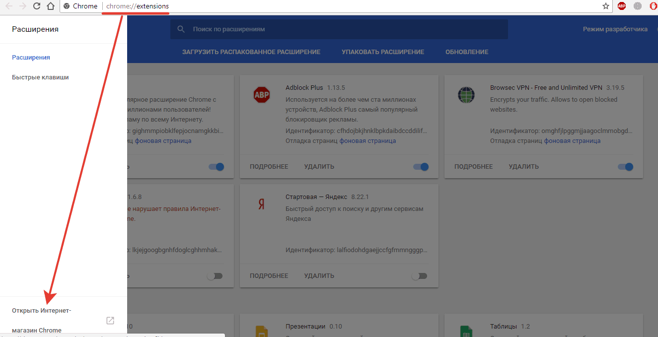 - Google Chrome. В главном меню в пункте «Дополнительные инструменты» переходите на вкладку «Расширения». Чтобы отключить плагин, необходимо убрать галочку напротив его названия;