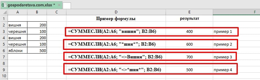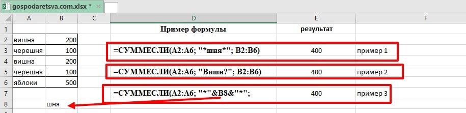 Пример2. Складывает значения ячеек B2: B6, если соответствующая ячейка в столбце A содержит частичное совпадение т.е последняя буква может быть любая. В примере я намерено допустил ошибку и написал вишна.