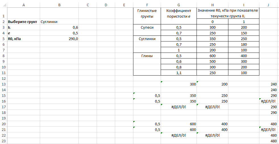 =ЕСЛИ(B2=»Супеси»;J14;ЕСЛИ(B2=»Суглинки»;J18;ЕСЛИ(B2=»Глины»;J23)))