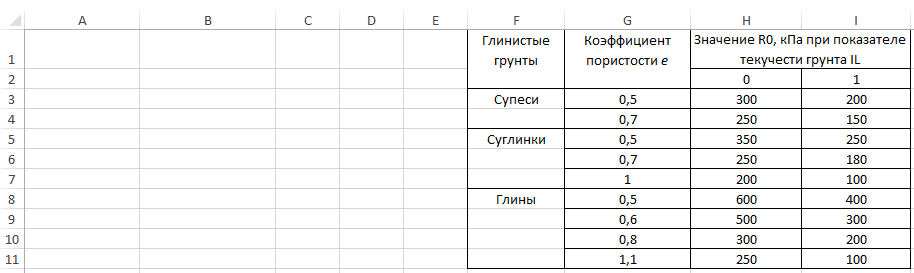 Построим таблицу Б3 из приложения Б СП 22.13330.2016 «Основания зданий и сооружений» Актуализированная редакция СНиП 2.02.01-83* (с изменениями №1, 2, 3) 2019 г. и автоматизируем получение R в зависимости от коэффициента пористости e, показателя текучести IL и выбранного типа грунта (рис. 12). Для удобства в ячейках H2 и I2 оставим только цифры.