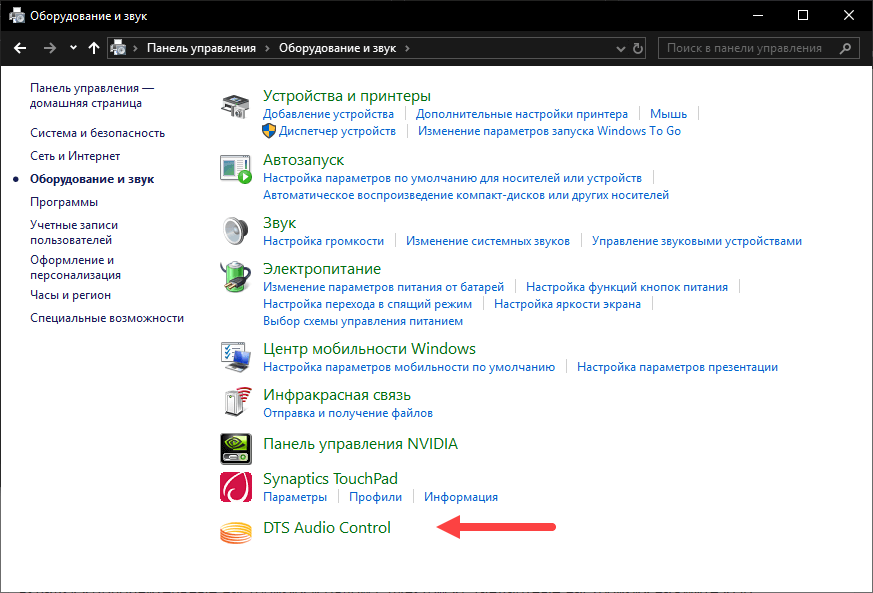 Чтобы найти эквалайзер DTS Audio Control, необходимо перейти в «Панель управления». Найти этот раздел можно через поиск. Далее открываем раздел «Оборудование и звук», затем DTS Audio Control.
