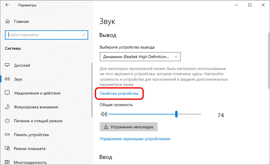 - Кликните «Свойства устройства», предварительно выбрав устройство воспроизведения.