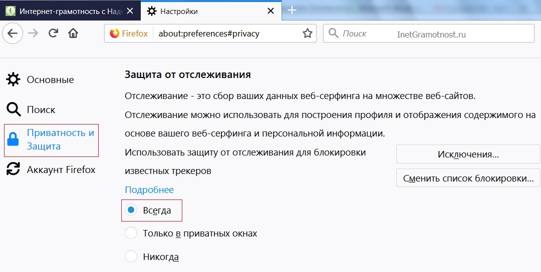 К сожалению, это разрешено по умолчанию для приватных, частных сеансов просмотра, поэтому стоит перейти к настройкам браузера (рис. 1) и проверить, что «Защита от слежения» включена в режим «Всегда» (рис. 2).