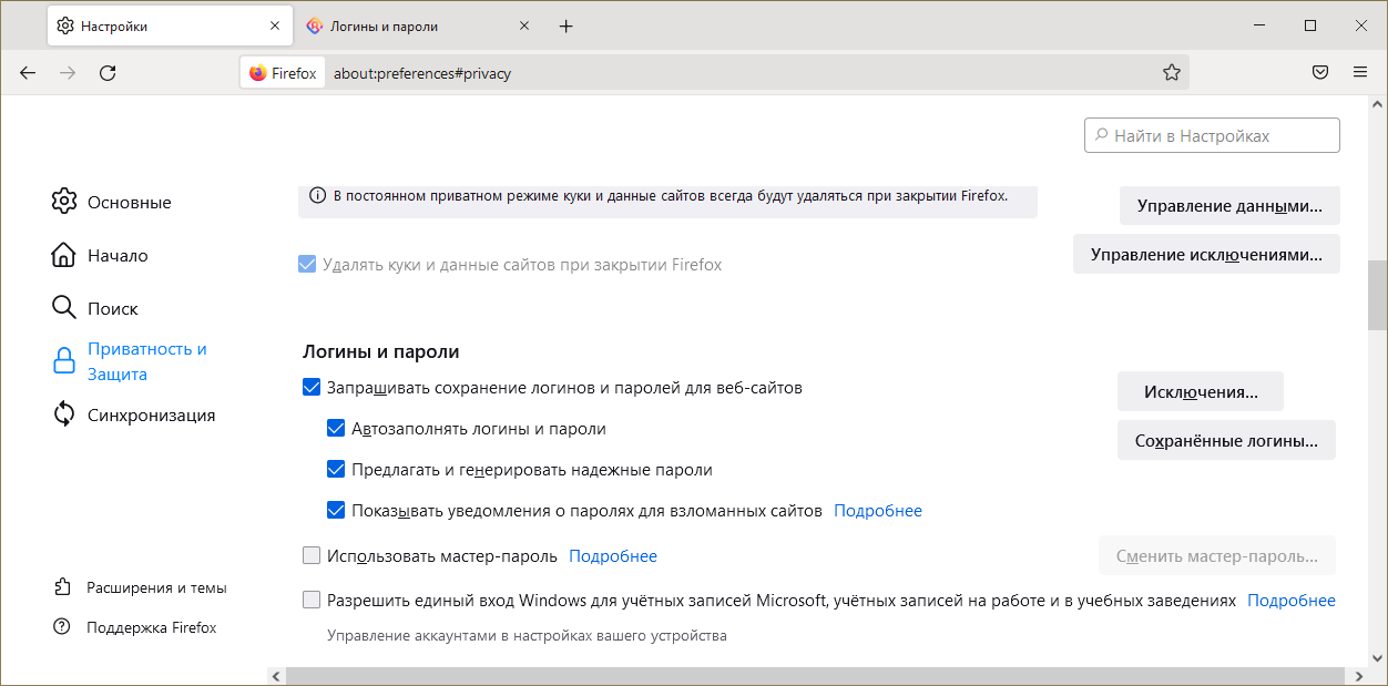 - Для получения информации о функции Мастер-Пароля, которая используется для защиты вашей личной информации, прочитайте статью Использование Мастер-пароля для защиты сохранённых имён пользователя и паролей.