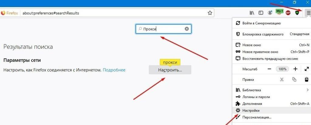 - В браузере Mozilla откройте настройки, далее «Сеть и интернет» → «Прокси» → «Настроить».