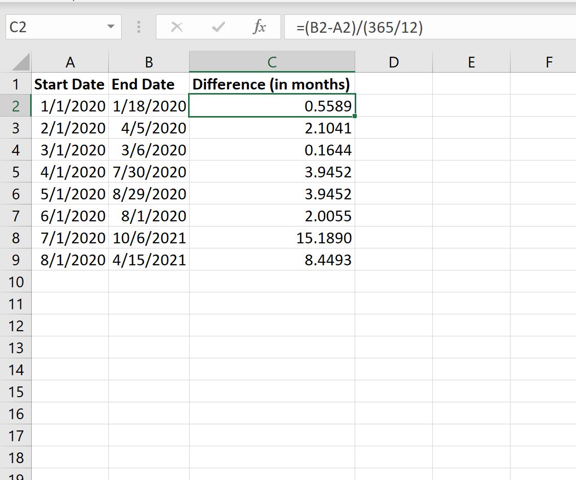 Столбец C показывает количество месяцев (включая десятичные разряды) между каждой датой начала и окончания.