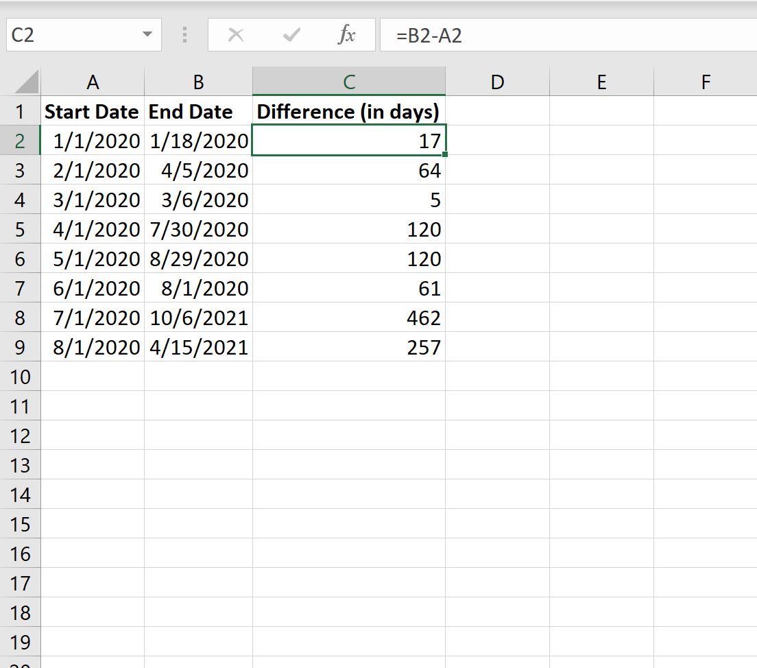 Столбец C показывает разницу (в днях) между каждой датой начала и окончания.