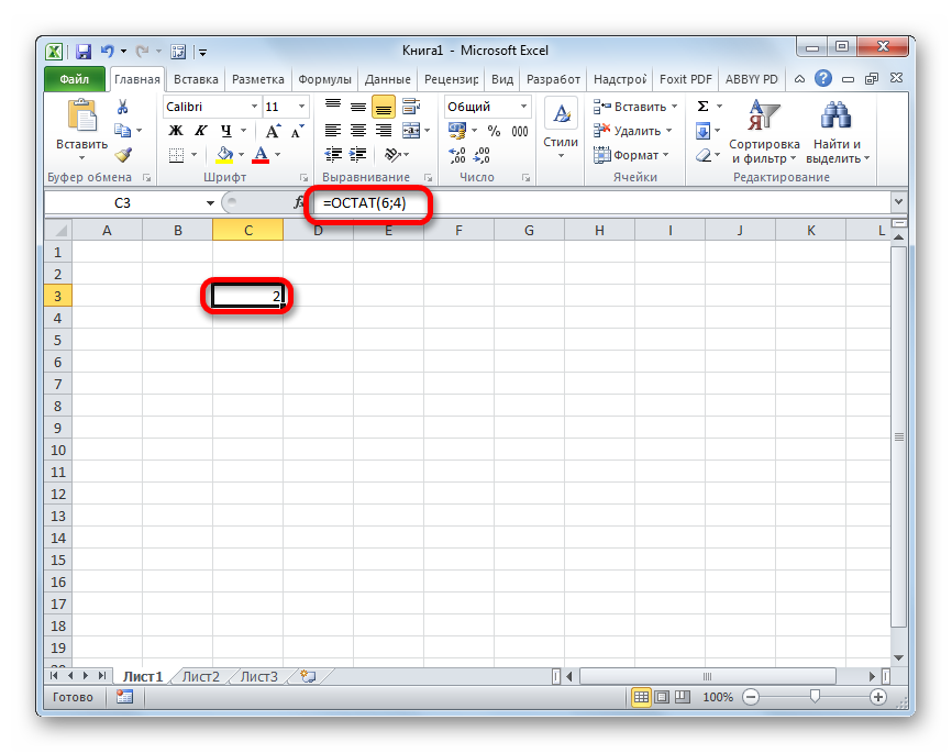 Наименование этой функции происходит от сокращенного названия термина «остаток от деления». Данный оператор, относящийся к категории математических, позволяет вывести остаточную часть результата деления чисел в указанную ячейку. При этом, целая часть полученного результата не указывается. Если при делении использовались числовые значения с отрицательным знаком, то итог обработки будет выводиться с тем знаком, который имелся у делителя. Синтаксис этого оператора выглядит следующим образом: