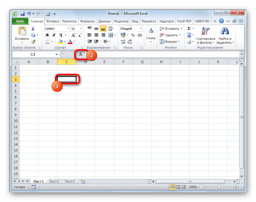 - Открываем книгу Excel, производим выделение ячейки, в которой будет указываться результат обработки данных, и кликаем по значку «Вставить функцию», размещенному около строки формул.