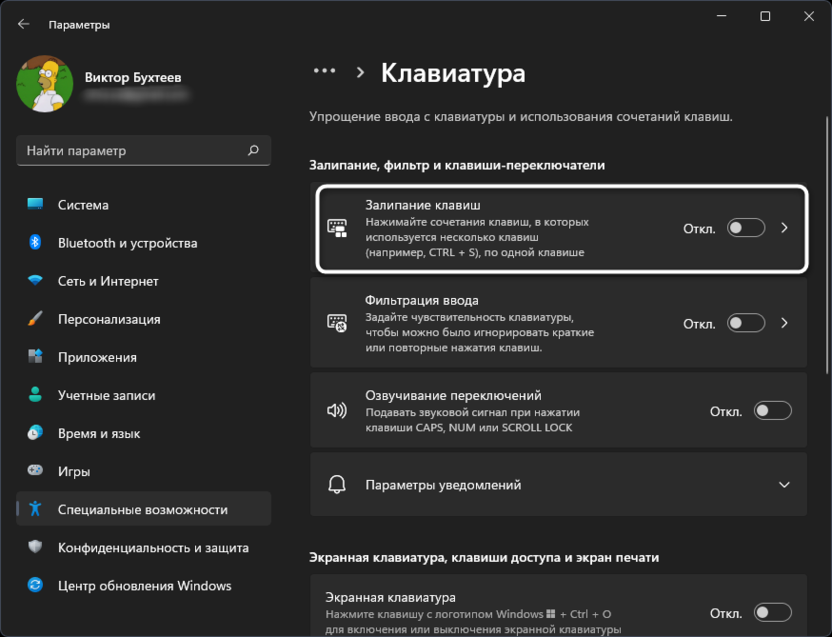 Выше я уже рассказывал о том, как открыть настройки клавиатуры через специальные возможности операционной системы. Перейдите в это же самое окно, найдите функцию «Залипание клавиш» и перетащите переключатель влево для отключения. Больше никаких действий выполнять не нужно, можно сразу перейти к проверке работы горячих клавиш в Microsoft Excel.