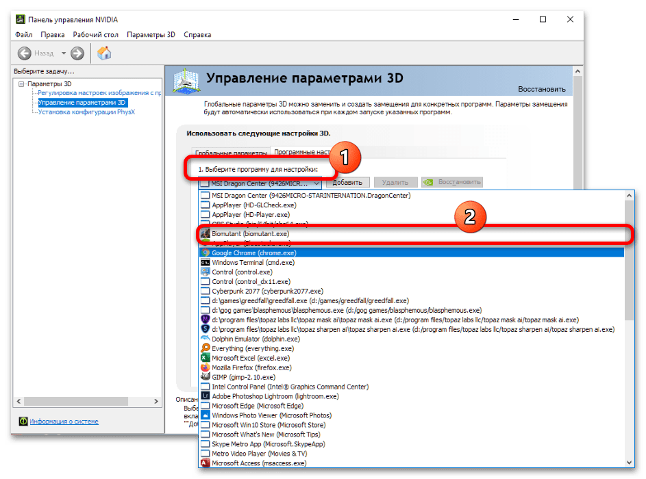 Далее откроется панель управления видеокартой (в нашем примере это NVIDIA). Здесь раскройте список «Выберите программу для настройки» и щёлкните по требуемой игре.