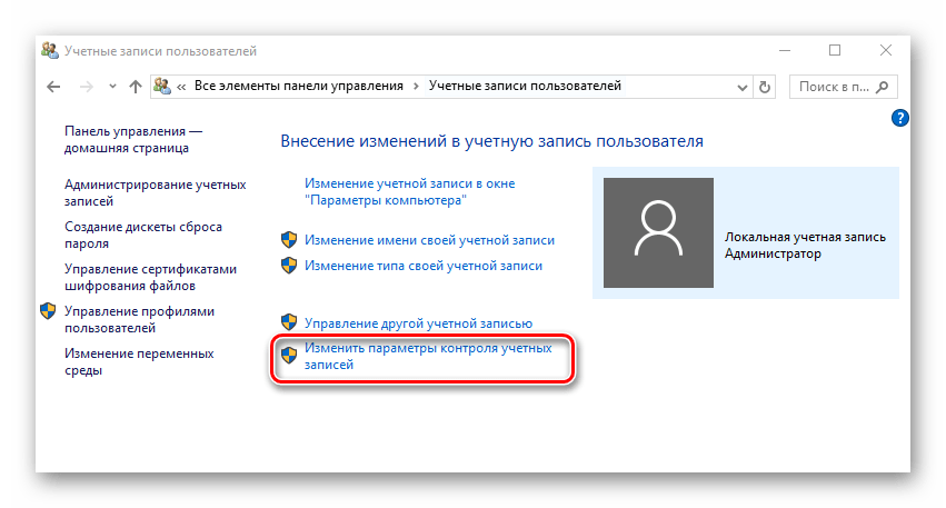На проблемы с DLL может влиять и система контроля учетных записей, чей активированный режим препятствует нормальной обработке библиотеки. Чтобы удостовериться или опровергнуть это, нужно отключить UAC, но сделать это можно только находясь под учетной записью типа «администратор». Гостевые профили при попытке отключения контроля столкнутся с уведомлением о недостаточных правах доступа. Обладатели разных семейств операционной системы могут сделать это, следуя рекомендациям одной из наших инструкций. Кликните на подходящее название ниже, а если деактивация UAC ничего не даст, не забудьте включить функцию обратно на тот же уровень.