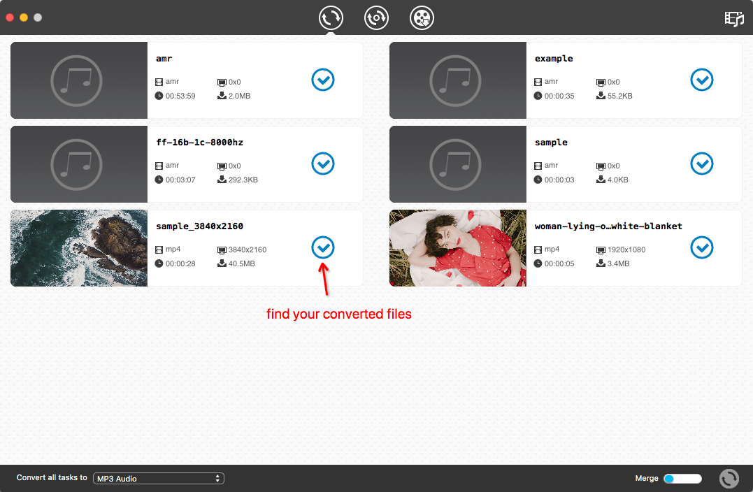 Click on the “convert” icon to change from source to destination file formats. A circular progress bar will appear next to each AMR file being converted.