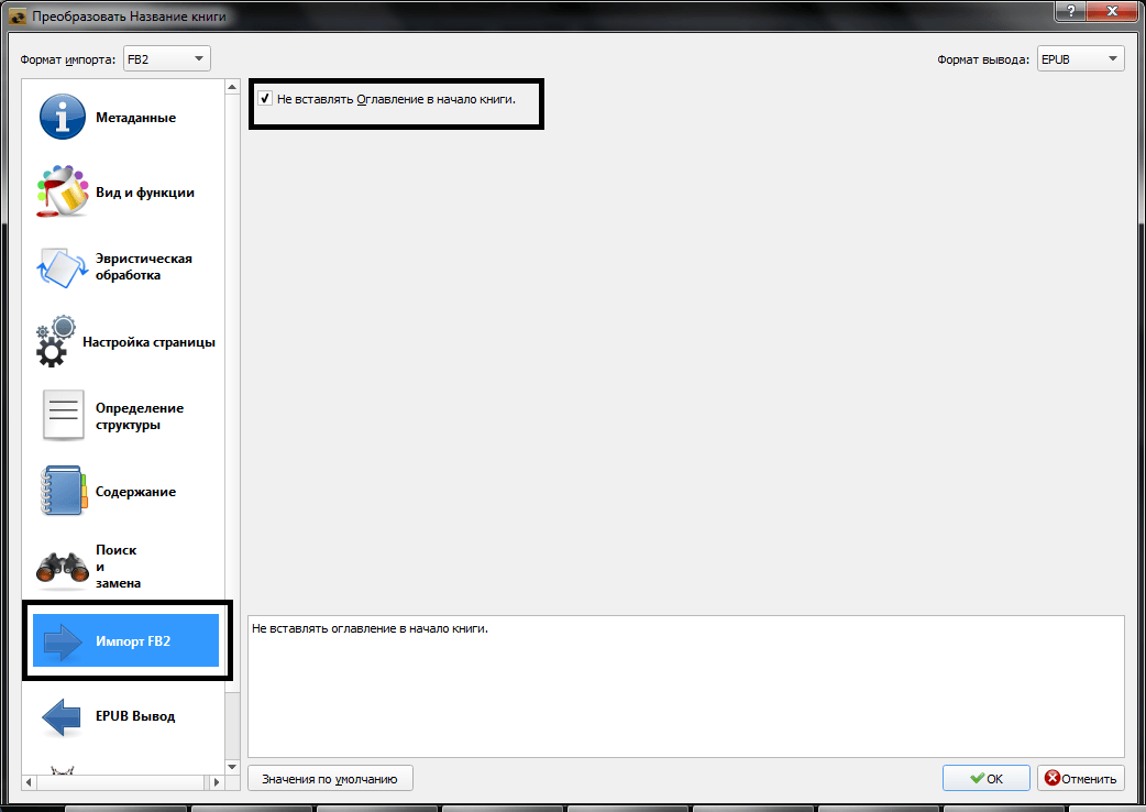 В разделе «Импорт FB2» ставим галочку «Не вставлять Оглавление в начало книги».