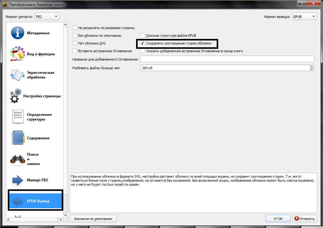В разделе «EPUB выход» ставим галочку «Сохранять соотношение сторон обложки».