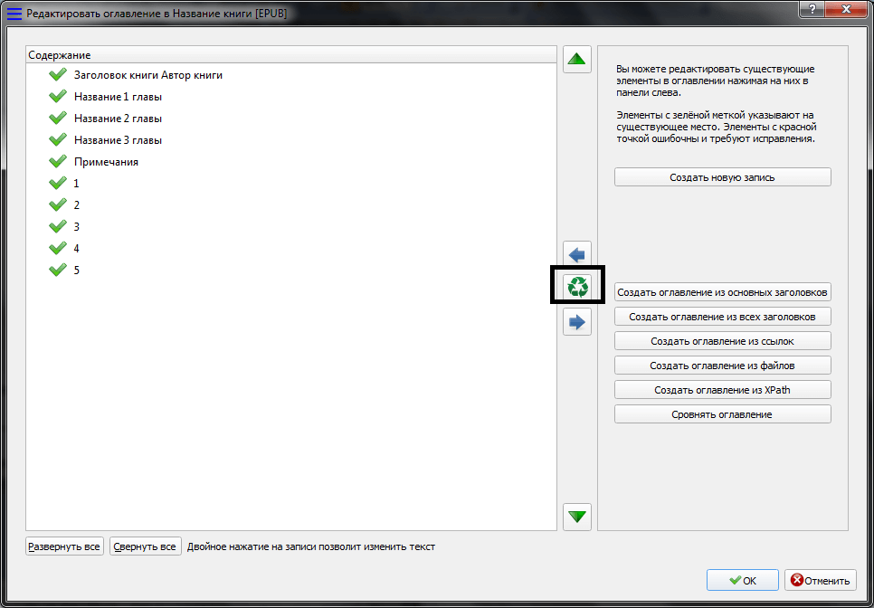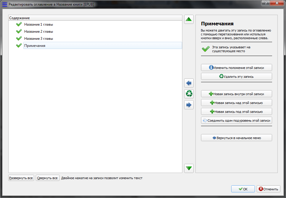 После установок указанных настроек можно нажимать «ОК» и процесс конвертации запустится. Когда дойдет очередь до формирования содержания, то программа покажет окно, в котором вручную можно добавлять или удалять разделы, которые будут находиться в содержании книги. У нас в примере в содержание попали сноски и заголовок книги, значит, нужно их удалить, выделив и нажав соответствующую кнопку.