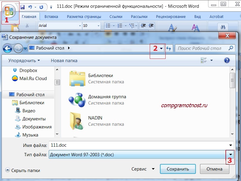 Рис. 2 Как файл со «старым» расширением.doc сохранить с «новым» расширением.docx или наоборот сохранить.docx в.doc