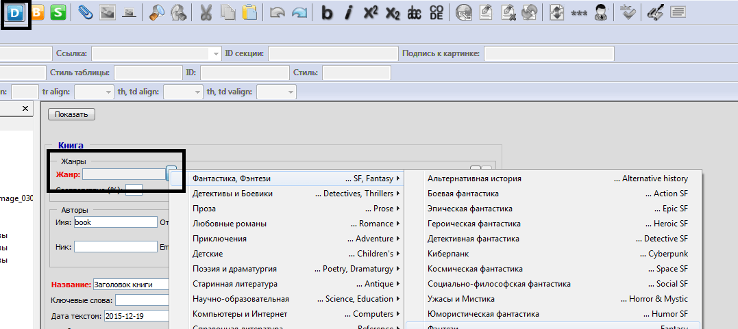 Первое, что надо сделать, это указать жанр, к которому относится наша книга. Проще всего это сделать войдя в режим «Описание документа» и выбрав соответствующий жанр из выпадающего списка.