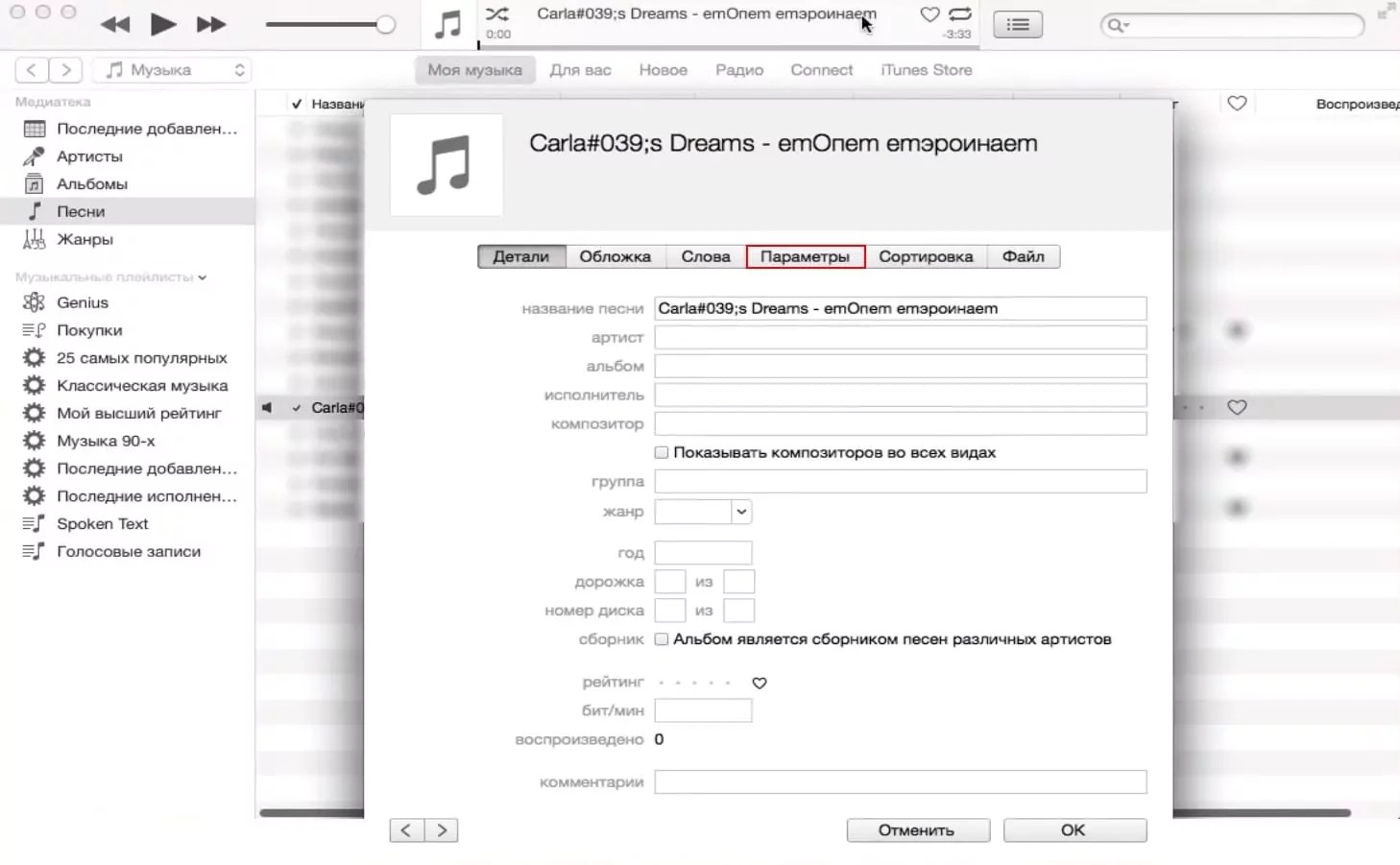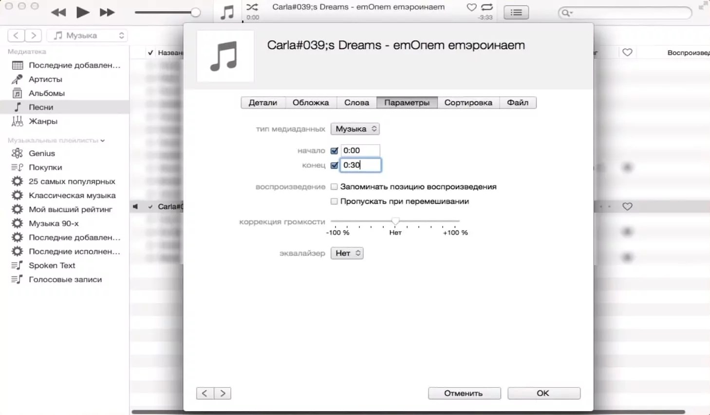 1. Использоваться будет только часть песни, поэтому кликните правой кнопкой мыши на название песни, выберите «Сведения о песне» (или «Получить информацию»), а затем перейдите во вкладку «Параметры».