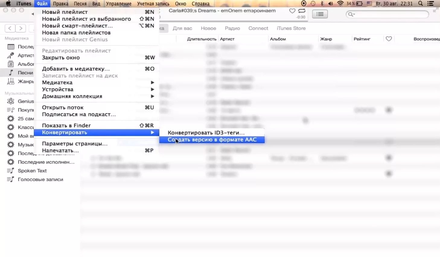 3. Теперь выделите песню, перейдите к пункту «Файл» в верхней части экрана, затем «Конвертировать» → «Создать версию в формате AAC» (в более ранних версиях порядок был таким: «Файл» → «Создать новую версию» → «Создать версию AAC»). Так создаётся рингтон для Айфона.