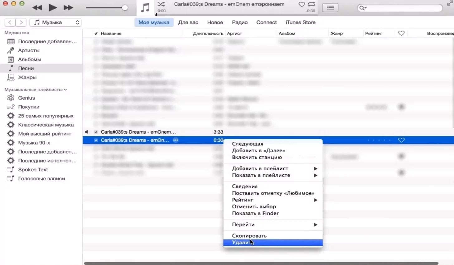 6. Вернитесь в iTunes и удалите короткую версию трека, не забывая прежде внимательно проверить его длину. Щелкните по файлу правой кнопкой мыши и выберите «Удалить» или «Удалить из библиотеки». После появления запроса подтвердите действие – «Удалить песню».