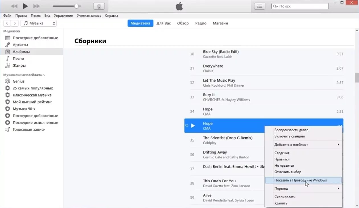 Сейчас следует кликнуть по короткому треку правой кнопкой мыши и выбрать пункт «Показать в Проводнике Windows».