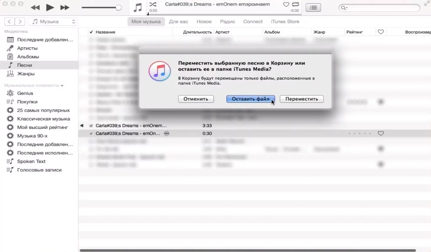 Очень важно, чтобы вы удалили файл только из библиотеки iTunes, а не с жесткого диска Mac. Поэтому если всплывет запрос с просьбой о подтверждении, хотите ли вы переместить файл в корзину, нажмите «Сохранить файл»