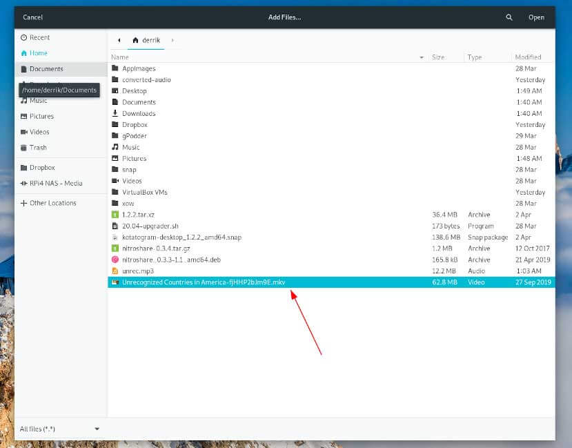 Шаг 3: Используя всплывающее окно, найдите видеофайл на вашем ПК с Linux, который вы хотите преобразовать в аудиофайл MP3.