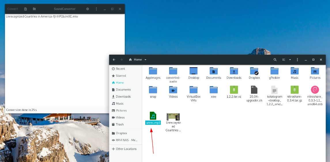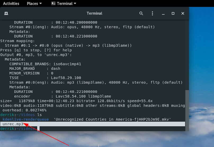 Когда процесс будет завершен, ваш видео файл будет преобразован в MP3. Чтобы получить доступ к преобразованному аудиофайлу, откройте диспетчер файлов Linux в том месте, где находится видеофайл.