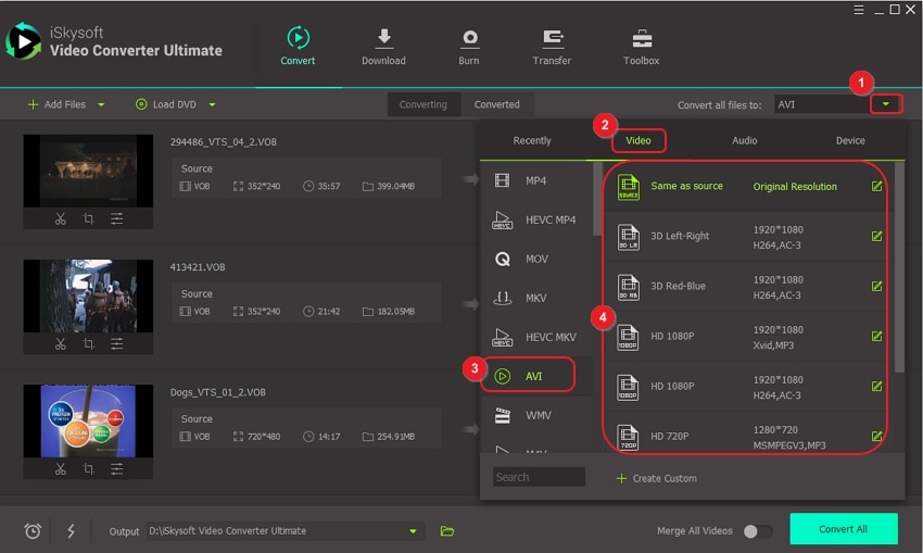 Go to Convert all files to drop-down menu and click on the Video tab. Click on «AVI» to set it as your VOB file’s output format. Then you can choose a resolution for it.