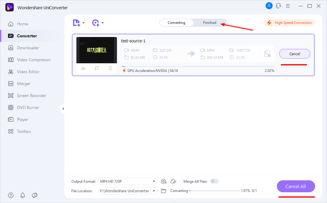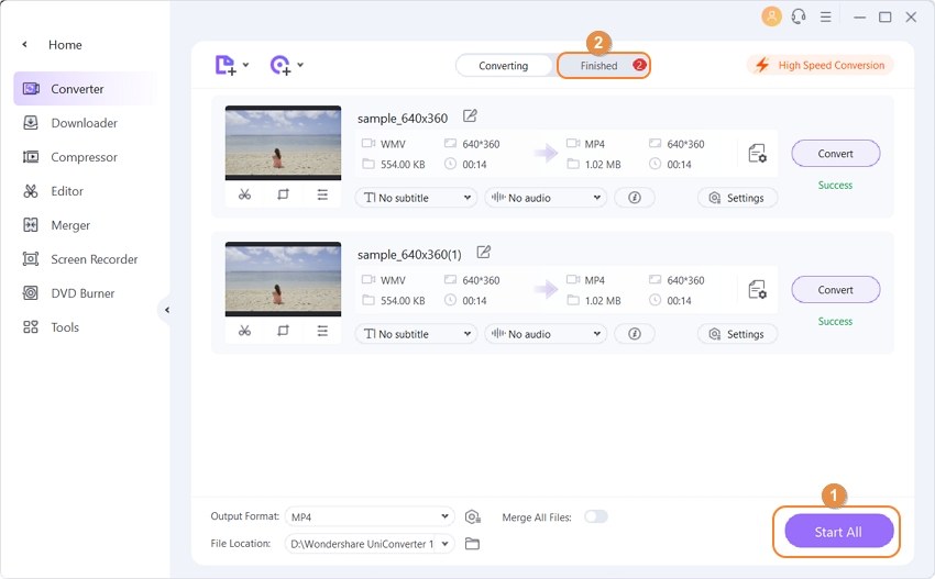Hit Start All to transform WMV to MP4, and it’ll complete the rest conversion automatically. Once finished, you can switch to the Finished tab to get the converted MP4 files.