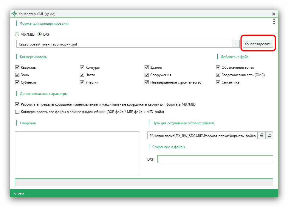 настроена для преобразования XML-файлов/документов Росреестра таких как кадастровые выписки, кадастровые планы территории в другие, удобные для использования форматы, такие как MIF/MID, DXF, CSV, TXT, HTML.
