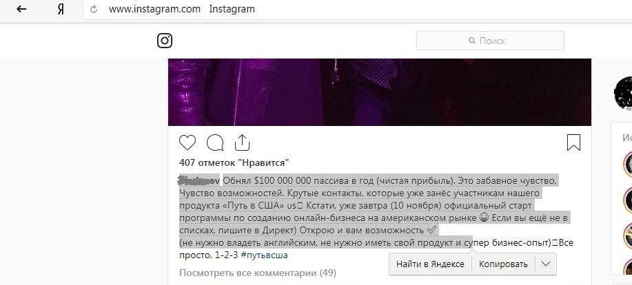Разработчики заблокировали возможность копирования только на мобильных версиях, поэтому на компьютере Инстаграм работает в полную силу. Чтобы «вытащить» понравившуюся подпись к фотографии или видео, необходимо: