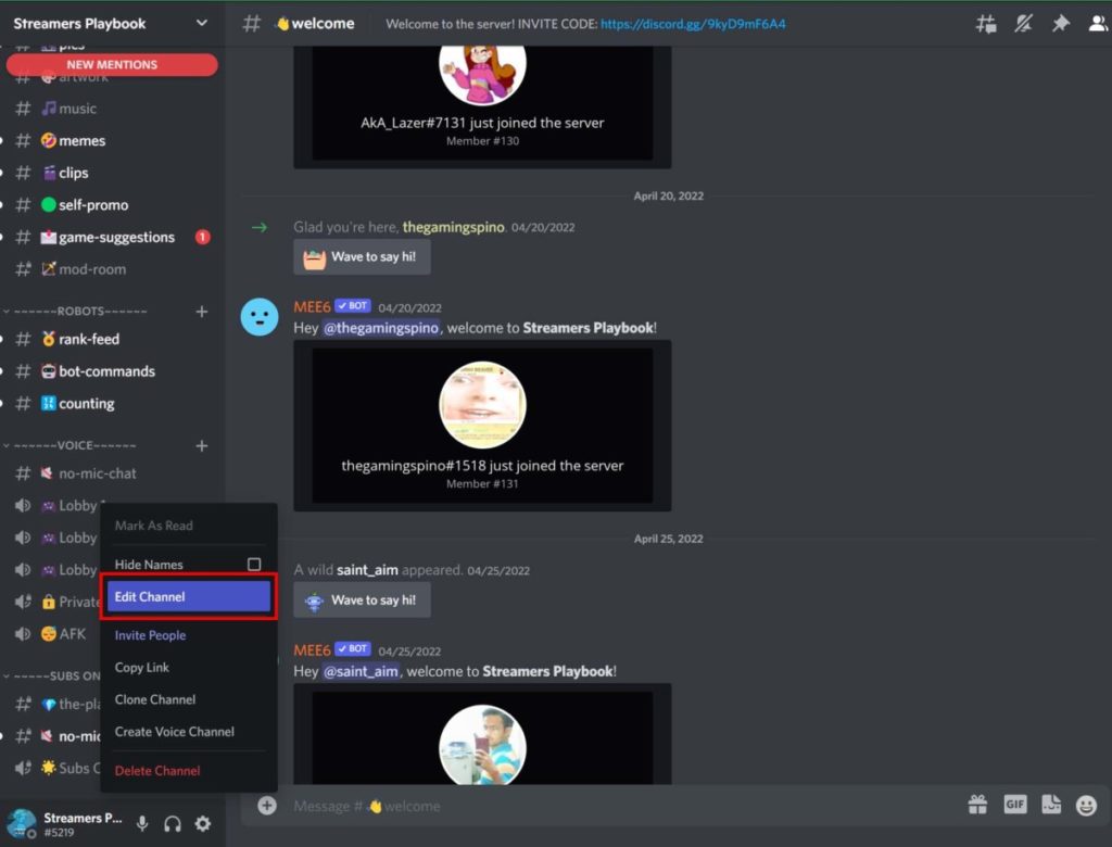 - Once in the server, Right-click on the channel you want to change and select “Edit Channel.”