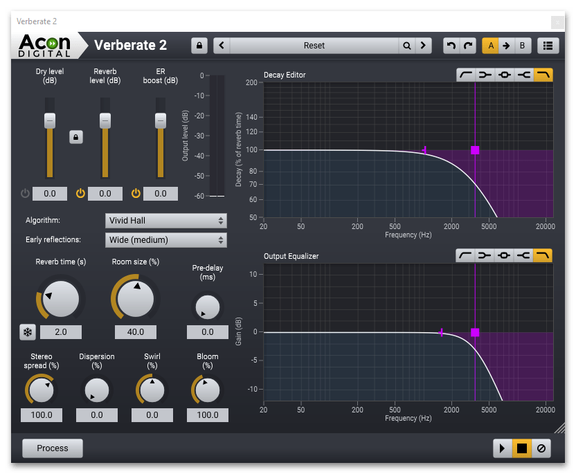 В программу включены наиболее распространённые эффекты, а также плагины для мастеринга и прочие инструменты, разработанные компанией Acon Digital. У каждого из них свой пользовательский интерфейс с набором готовых пресетов, а также ползунками, тумблерами и другими переключателями для ручной настройки. Любые изменения параметров всегда можно откатить на несколько шагов назад, причем Acoustica поддерживает функцию сравнения результатов до и после настройки одним нажатием клавиши.