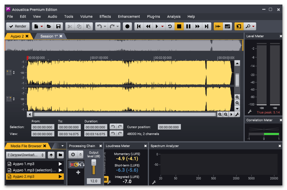 Acoustica от Acon Digital – цифровая рабочая станция для записи, редактирования аудио, создания подкастов и прочего. У нее нет инструментов для написания музыки, но есть продвинутые средства для тщательной ее обработки, что может пригодиться при наложении аудиофайлов друг на друга. Софт поддерживает многодорожечное микширование, но его главное отличие в том, что работать можно в нескольких вкладках одновременно. Например, в одной сводить аудио, в другой записывать звук, а в третьей работать с отдельным отрезком музыкальной композиции.